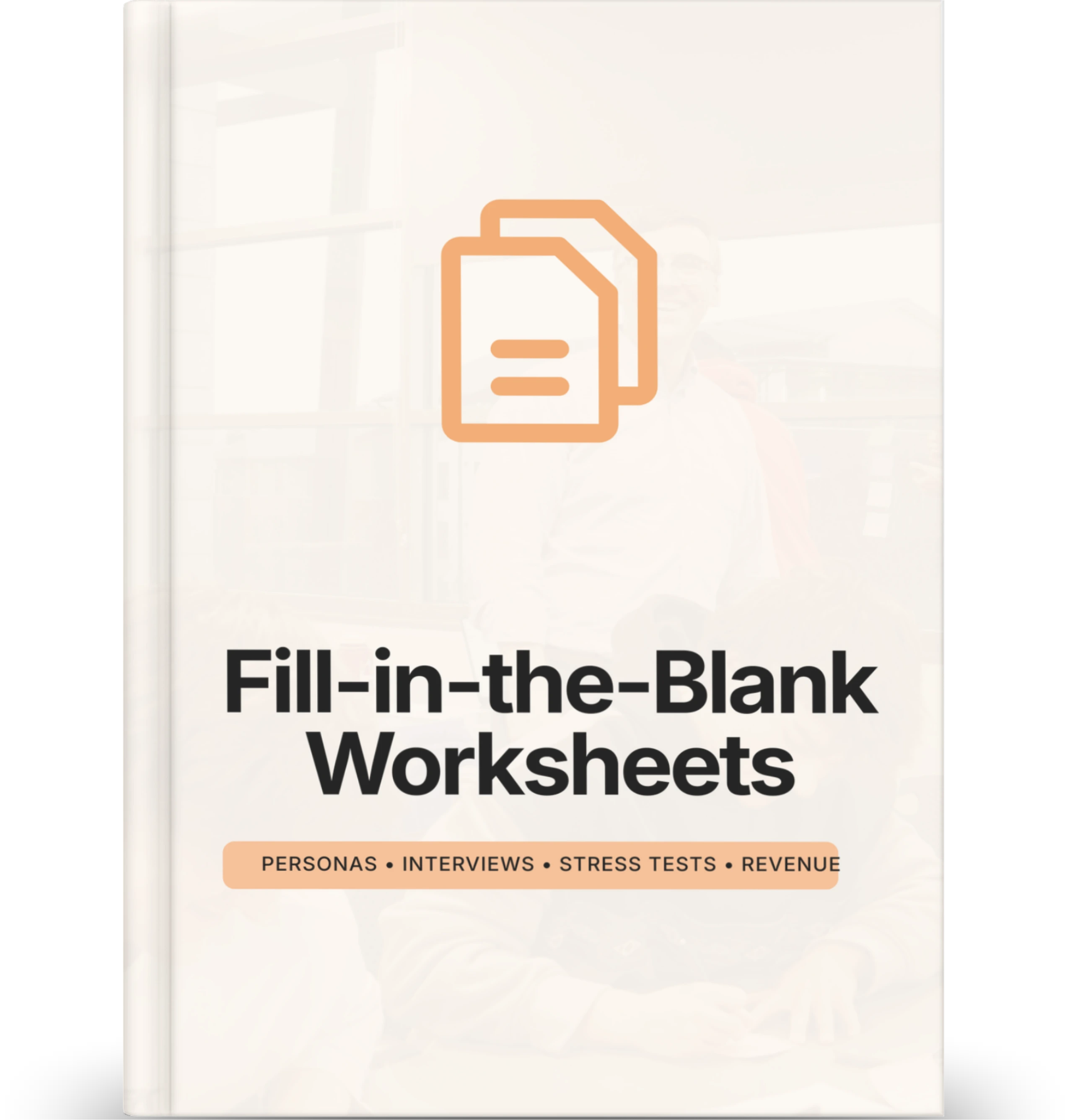 Every step has a template—idea statements, persona builders, interview notes, stress tests, revenue projections. Just fill in the blanks and move forward.